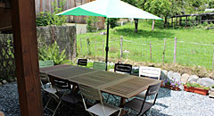 Mobilier de jardin : table et chaises, parasol et barbecue